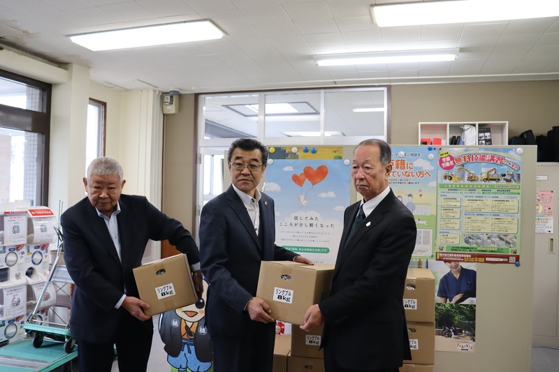 北斗ライオンズクラブさんは奉仕活動の一環として、毎年回収活動に協力していただいており、柳浦政春会長、梅村俊範社会奉仕委員長、蓑谷克行幹事が社協に来局いただき、社協瀧会長に直接リングプルが手渡されました。